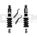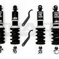 The coilover system is finished with a combination of powder coating, electroplating, and anodizing to give it a great look and protect it. McPherson style struts feature adjustable upper camber plates and pillow ball mounts.
