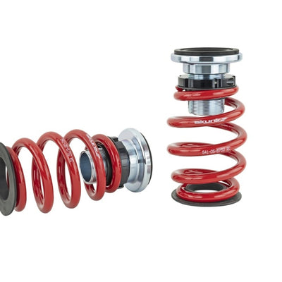 A suspension system is only as strong as its mount to the chassis, so all Pro-ST kits include aluminum, CNC machined, anodized top mounts for maximum strength and protection from the elements. High quality polyurethane bushings are included to keep precise handling and feedback while retaining a cushier feel for the street. Additionally, a padded spring seat at the top and nylon thrust washers at the bottom of each spring reduces friction to eliminate noises from spring bind commonly found in many coilover systems.