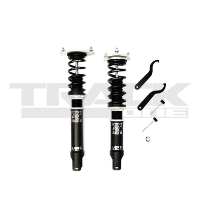 The coilover system is finished with a combination of powder coating, electroplating, and anodizing to give it a great look and protect it. McPherson style struts feature adjustable upper camber plates and pillow ball mounts.
