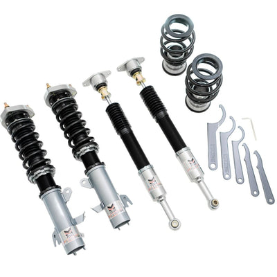 Height adjustments are made with separate CNC Machined locking spring perches for accuracy and smooth adjustment with separate damper shock length adjustment to retain full-stroke and allows for precision suspension tuning. The wide range of allowable ride height adjustment allows for a conservative drop to more aggressive ride heights for an aggressive stance, or to fine tune your suspension for the circuit to gain full potential of your vehicle's handling capabilities.