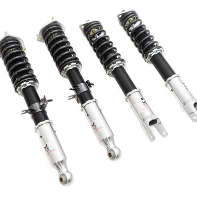 Featuring 32 levels of damper force adjustment, pillowball top mounts and full length shock adjustability. Ride height can be adjusted separately from spring preload allowing for precise tuning while compression and rebound damping are simultaneously adjusted via knobs accessed on the top of each damper. The wide range of allowable ride height adjustment allows for a conservative drop to more aggressive ride heights for an aggressive stance, or to fine tune your suspension for the circuit to gain full potential of your vehicle's handling capabilities.